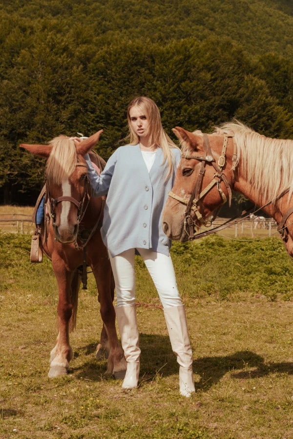 Questo cardigan artigianale in lana e cashmere rappresenta un capo senza tempo, perfetto per ogni occasione. Realizzato con la tecnica del rimaglio, presenta cuciture resistenti e quasi invisibili, che donano un aspetto pulito e raffinato. Lo scollo a V profondo aggiunge femminilità e versatilità, rendendolo facile da abbinare a camicie, top o da indossare sulla pelle nuda per un look essenziale.