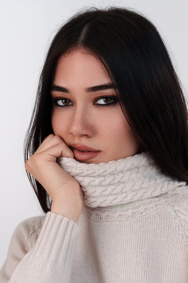 Il capo è realizzato in un filato pregiato composto da 37% cashmere, 30% lana merino e 33% viscosa. Al tatto la maglia risulta morbida e soffice, calda e avvolgente ma al tempo stesso leggera e fluida. La caratteristica di questa composizione è la combinazione tra comfort, resistenza e naturalezza, che assicura qualità e durata nel tempo.