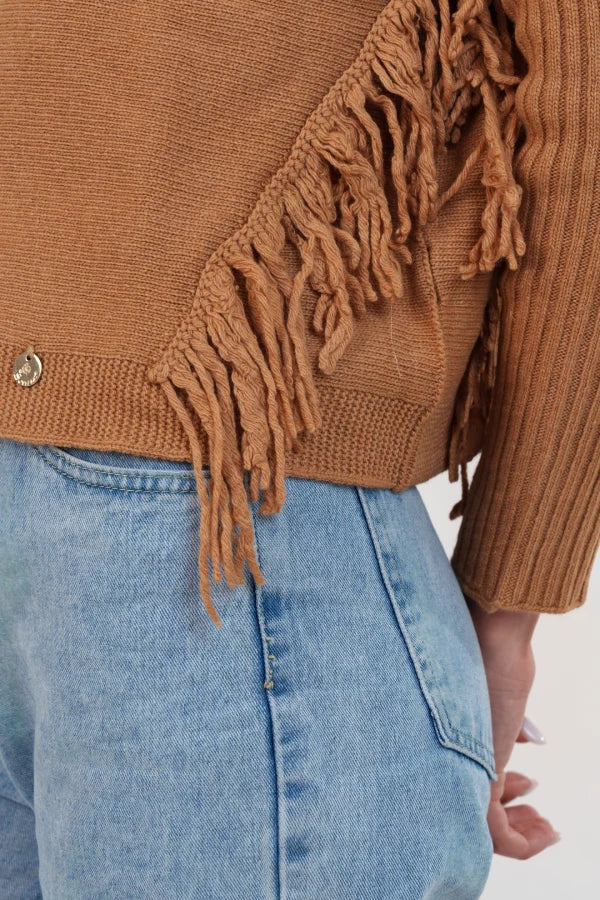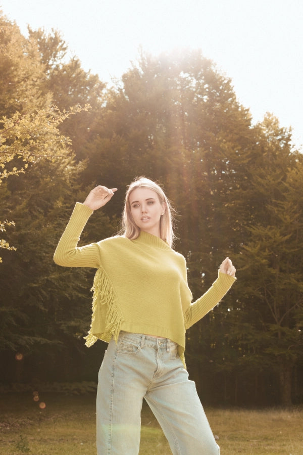 Il busto è lavorato a rasato, mentre le maniche in costina aggiungono contrasto e struttura. Le frange che scendono trasversalmente sul davanti regalano movimento e slanciano la figura, rendendo il design dinamico e originale. Il mezzo collo e le maniche lunghe offrono calore e protezione, mantenendo un aspetto elegante e contemporaneo.