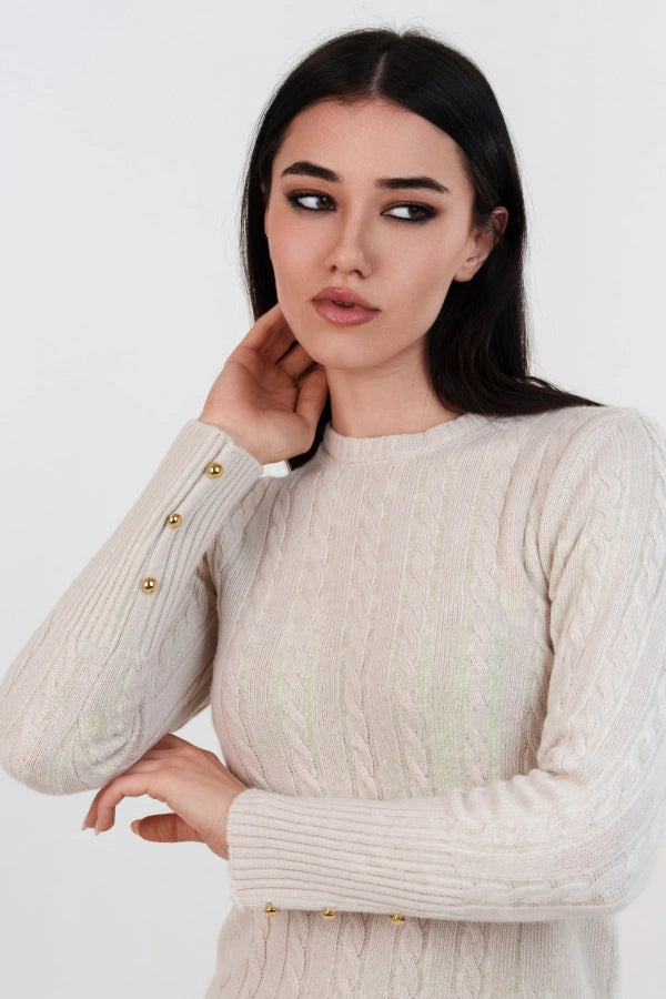 Questo pullover artigianale rappresenta un capo senza tempo, perfetto per ogni occasione. La lavorazione principale a trecce, presente sul davanti e sulle maniche, dona tridimensionalità ed eleganza, mentre i fianchi in maglia rasata alleggeriscono la linea. Il girocollo e le maniche lunghe aggiungono sobrietà, mentre i polsini alti creano un tocco distintivo.