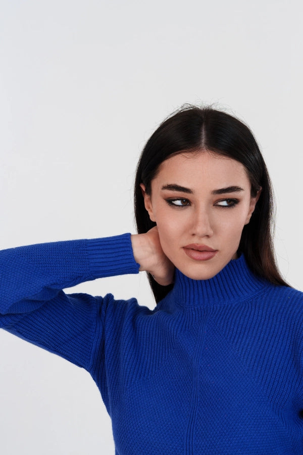 La lavorazione presenta un motivo a costina che si apre verso il fondo, donando movimento e un tocco artigianale al design. La vestibilità crop lo rende ideale da abbinare a pantaloni e gonne a vita alta, per look moderni e versatili. Il mezzo collo aggiunge protezione e raffinatezza, mentre la struttura leggera e confortevole lo rende adatto alle stagioni intermedie.
