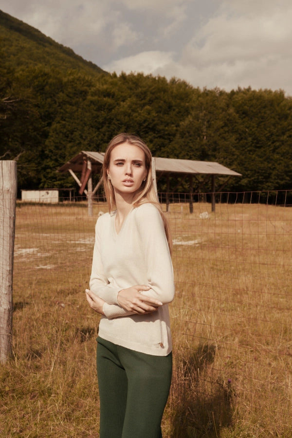 Questa maglia artigianale in pura lana merino rappresenta un capo senza tempo, perfetto per ogni occasione. Realizzato con una lavorazione a rasato sottile, il pullover è morbido, leggero e confortevole. Le maniche lunghe e lo scollo a V donano un’eleganza discreta, mentre i polsini alti aggiungono un tocco distintivo, contrastando con il fondo basso che conferisce un aspetto più rilassato.
